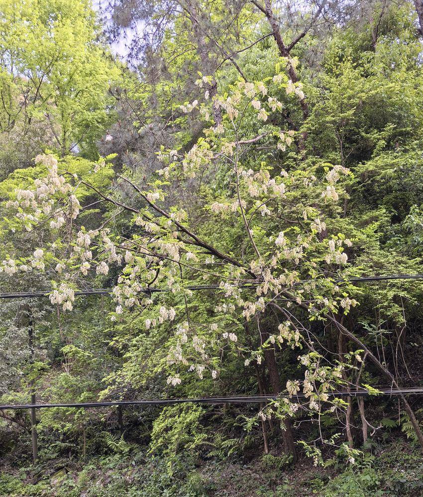 我慢悠悠地走着,目光无意间扫过北渠靠龙翔山的一侧,忽然被一抹洁白撞入眼底——只见一棵树的枝头缀满了洁白的花朵,一簇簇、一串串,垂在弯曲的枝桠间,仿佛是大自然亲手系上的白丝带。树干呈微微弯曲状,想来是被这满枝的繁花压弯了腰。我一时竟叫不出花的名字,由于隔着渠沟,无法近距离细看,心底的好奇愈发浓烈。于是,我掏出手机,调整焦距,将那满枝洁白拉近、定格,用识物功能一查,原来是洋槐花!那一刻,我竟像个找到宝贝的孩子,满心欢喜,难以言喻。